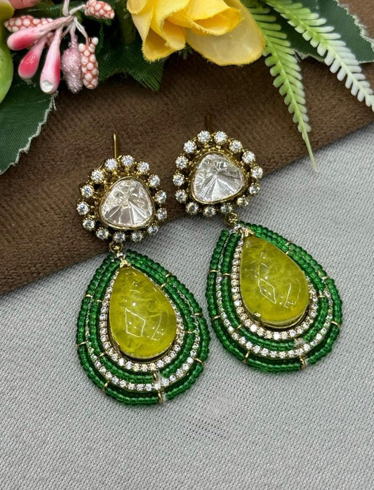 Long Beading Kundan Earring in green for woman