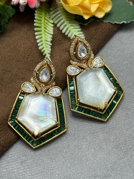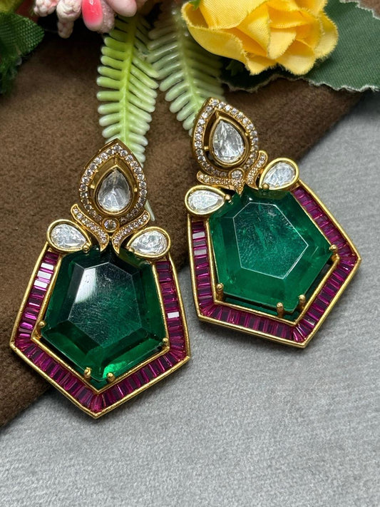 Carving Doublet Stone With Triangle Mossanite in Emerald Green earring