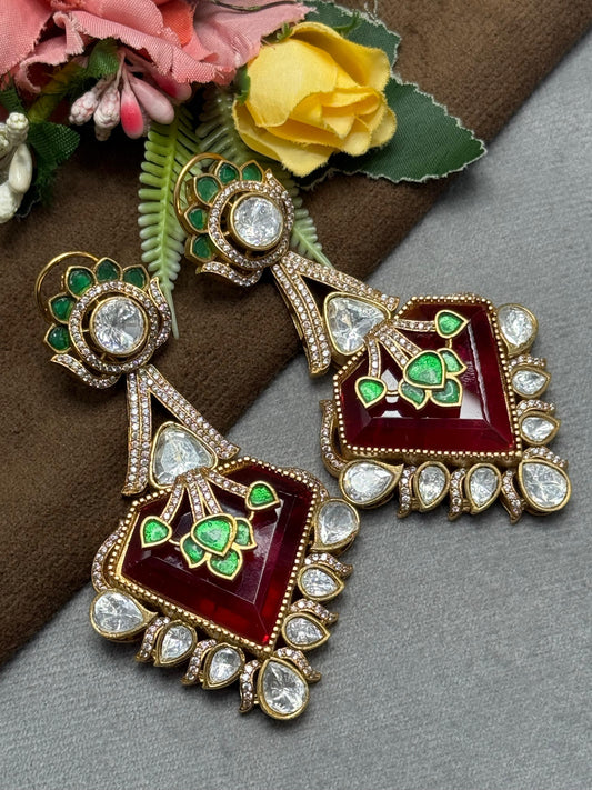 Carving Doublet Stone With Triangle Mossanite in Red earring