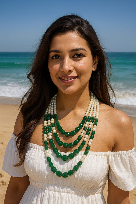 Elegant Multi-Layer Emerald Green Bead & White Pearl mala for Women