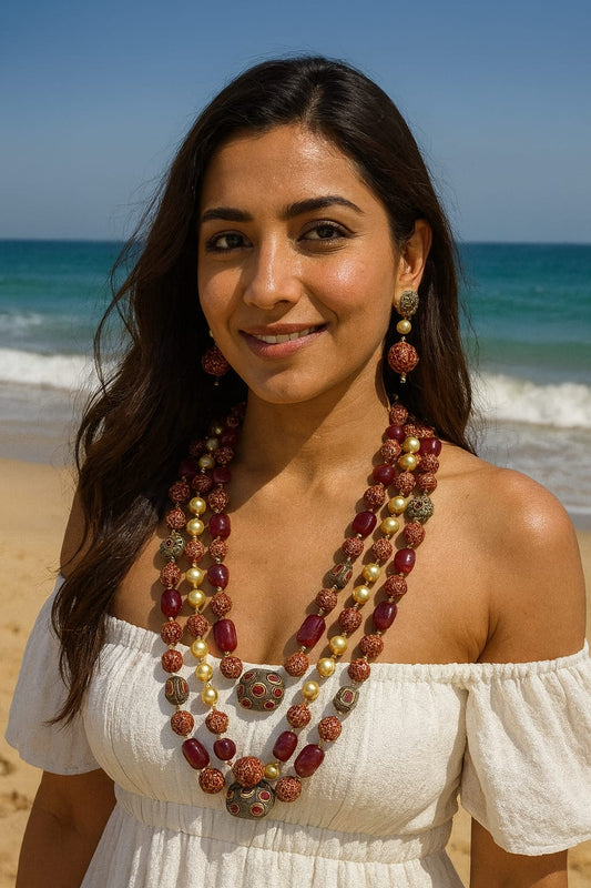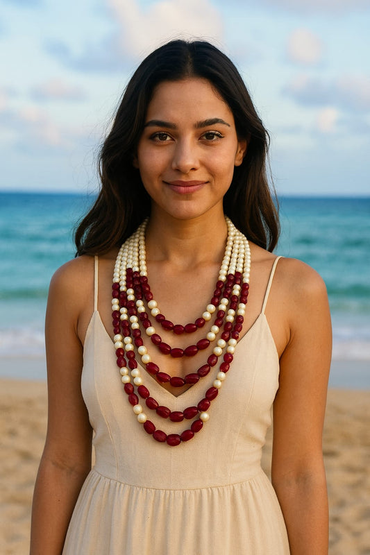 Elegant Multi-Layer Emerald Red Bead & White Pearl mala for Women