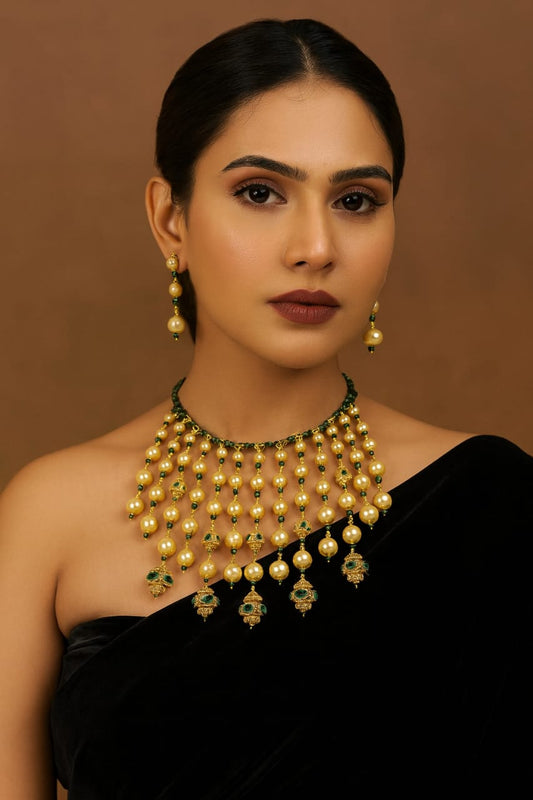 Antique Gold Pearl Kundan mala with Green Beads & Earrings