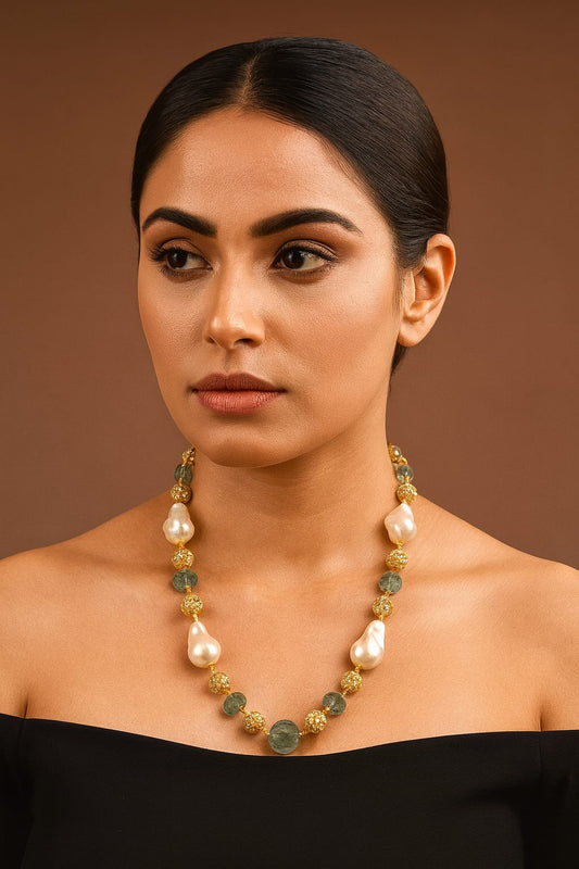 Handcrafted Baroque Pearl & Green Stone Mala For women