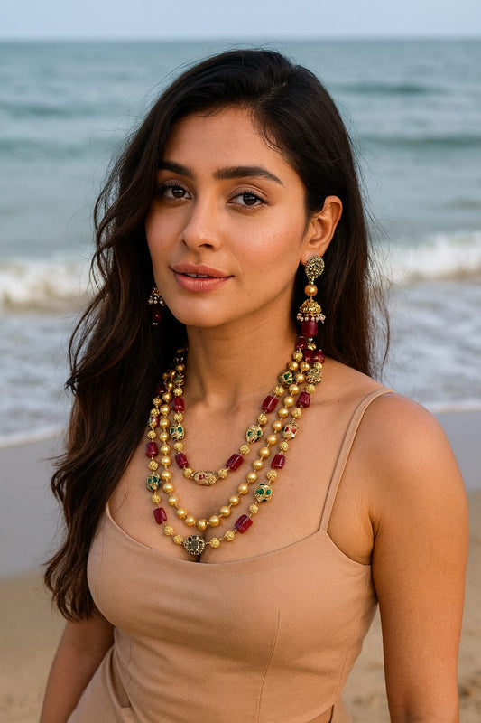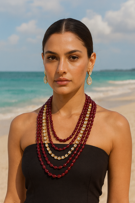 Grand Emerald Red Beaded Mala with Gold & Stone with Five Layer