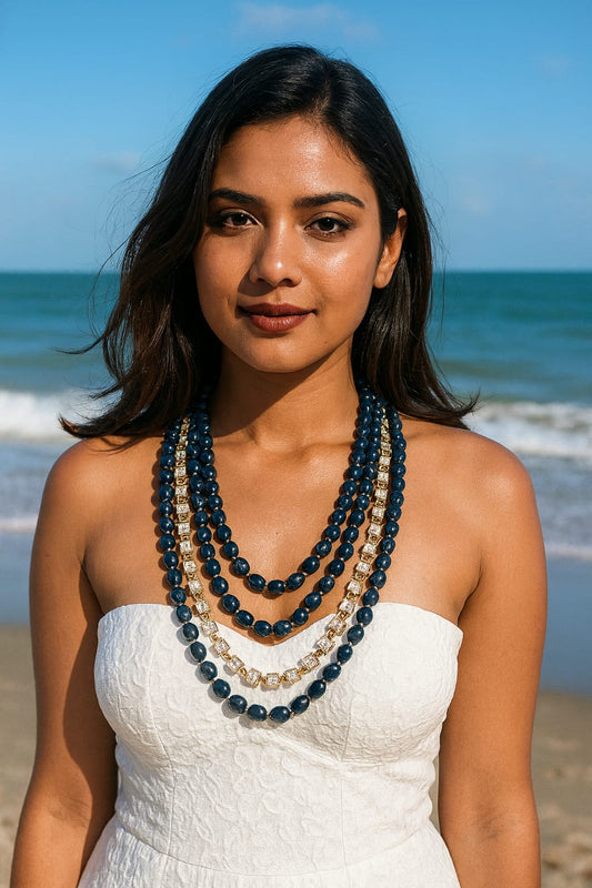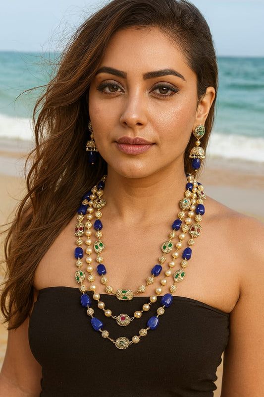 Grand Emerald Blue Beaded Mala with Gold & Stone with Five Layer