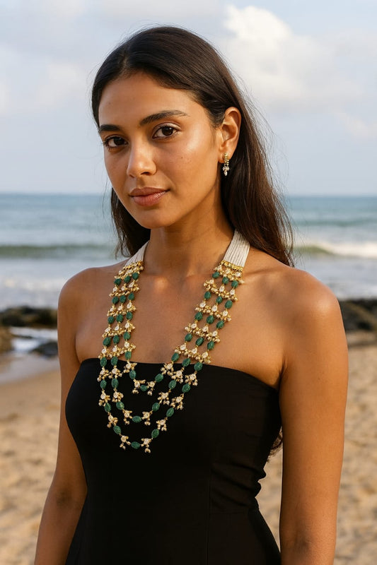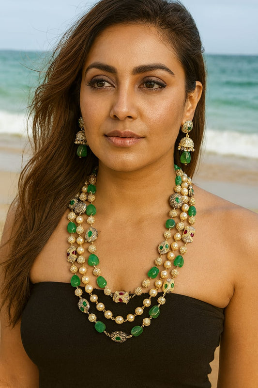 Designer Green Pearls & Kundan Beaded Mala with Three layer