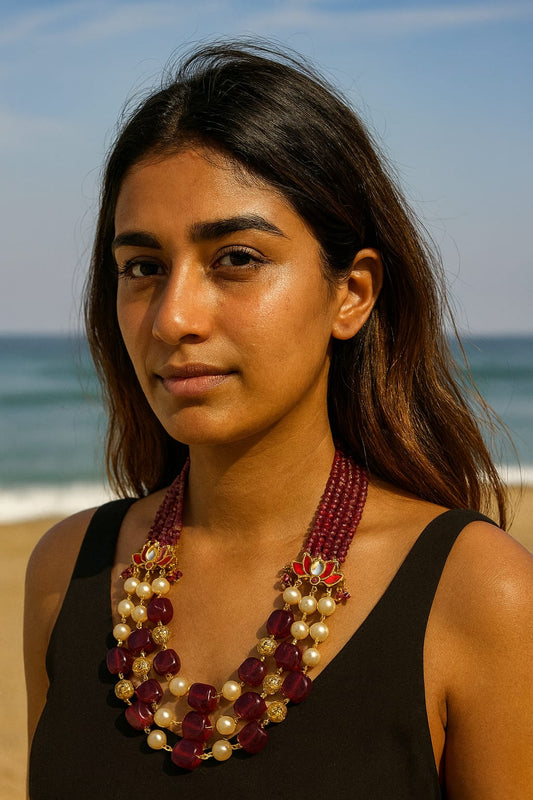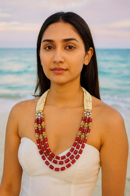 Designer Red Pearls & Kundan Beaded Mala with Three layer