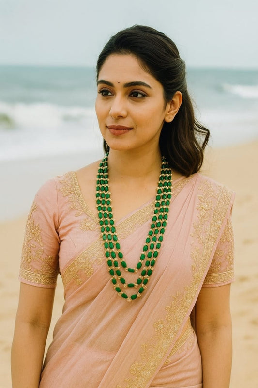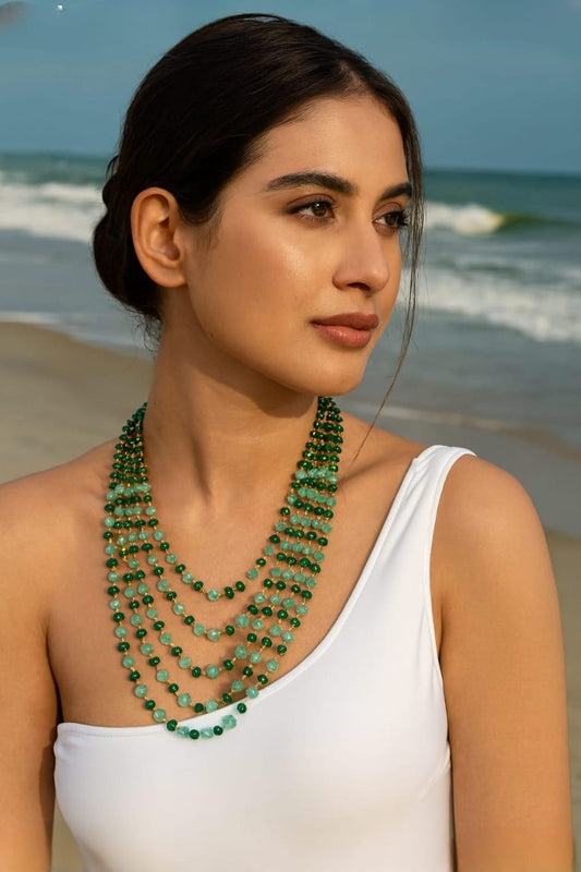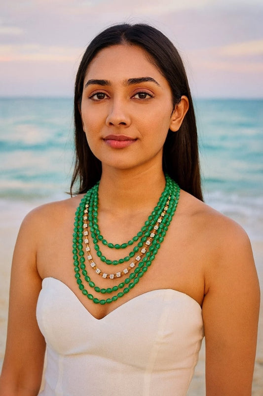 Grand Emerald Green Beaded Mala with Gold & Stone with Five Layer