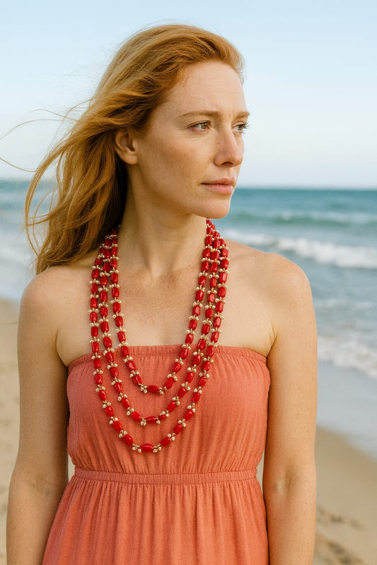 Designer Red Beads & Gold Tone Multi-Strand Mala Necklace For Women