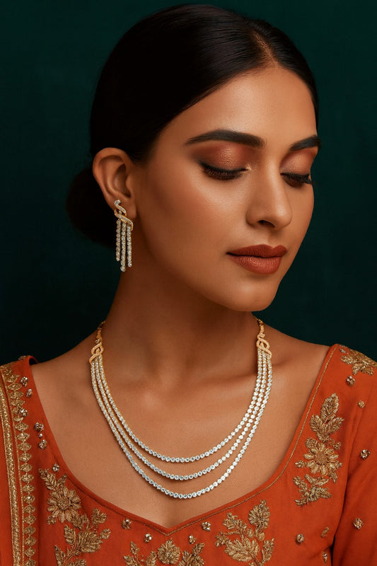Gold & Silver Triple Layer CZ Necklace Set with Earrings