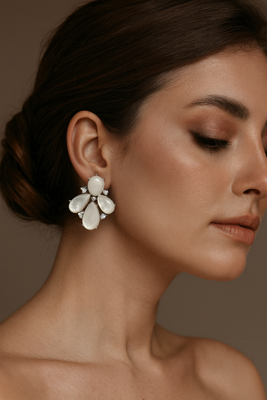 White Prehnite & Mother of Pearl Floral Earrings with CZ stone