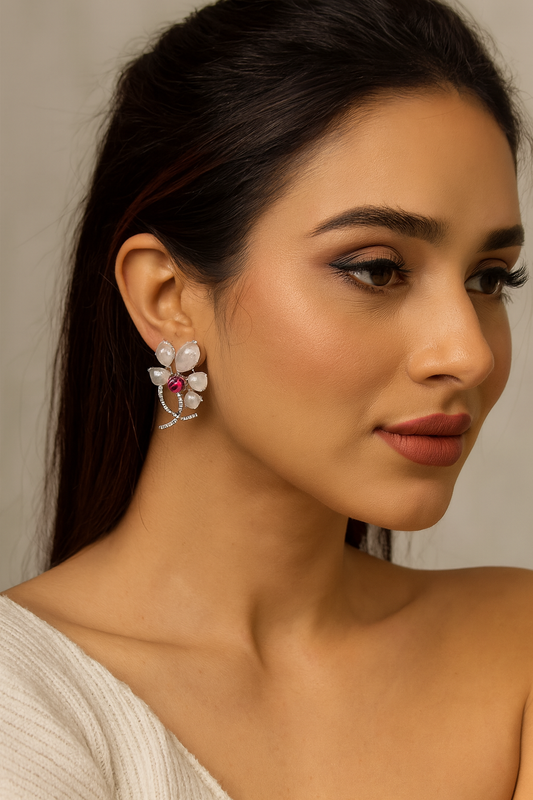 Floral Rose Quartz & Ruby Earrings with CZ Accents
