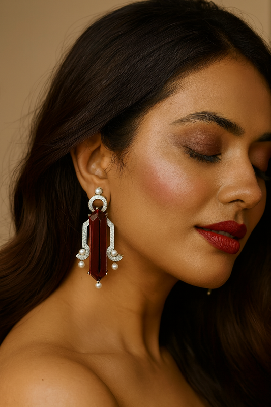 Red Amethyst Long Drop Earrings with Pearl Accents
