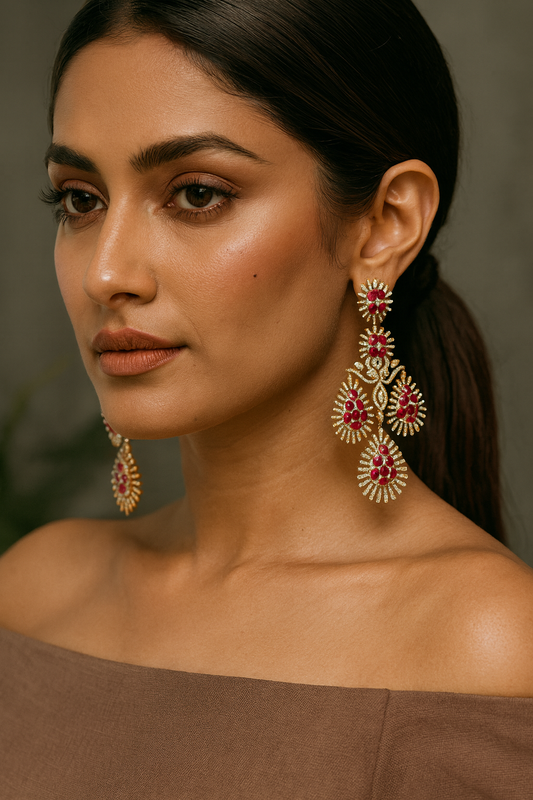 Ruby Red CZ Chandelier Earrings with Gold Finish