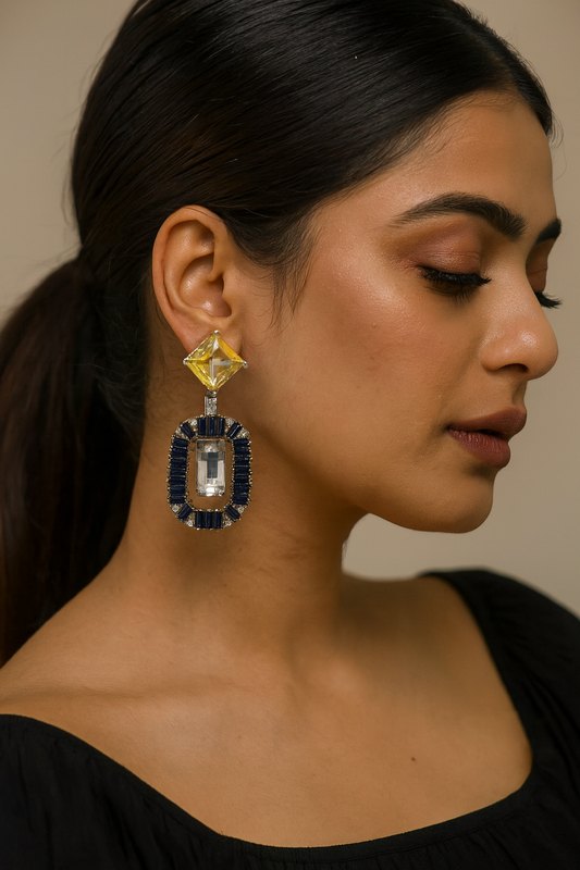 Unique Statement Earrings with Blue Stones and Sparkling Drops
