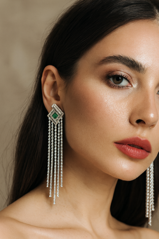 Long Silver Tassel Earrings with Green Stone and CZ Stone