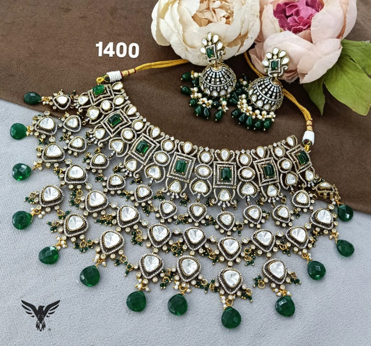 Aditee polki with emerald green stones bridal necklace in mosanite with jhumkis for women and bridals