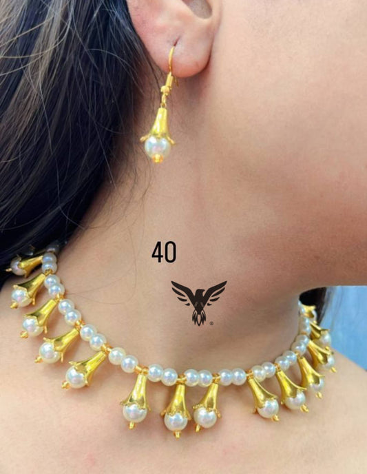 Antique Gold Pearl Kundan mala with red Beads & Earrings