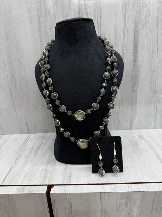 Antique Gold Pearl Kundan mala with Green Beads & Earrings