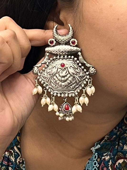 Antique Oxidized Silver Earrings with Red Stones & Pearl Drops