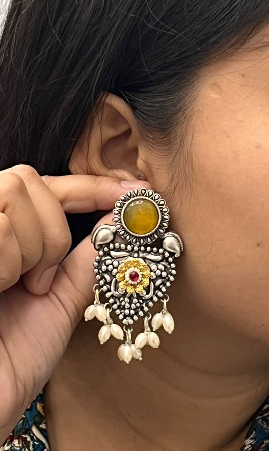 Antique Oxidized Silver Earrings with Yellow Stone & Pearl Drops