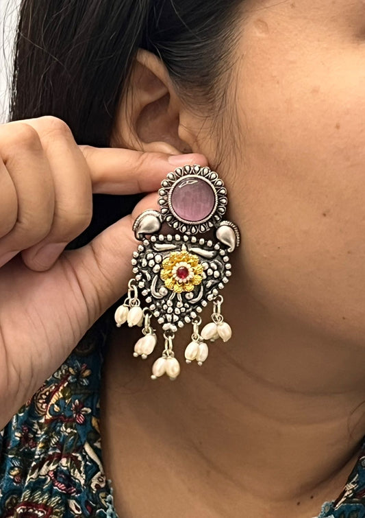 Antique Oxidized Silver Earrings with Pink Stone & Pearl Drops