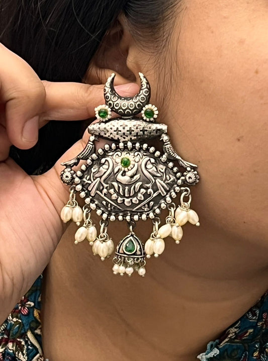 Antique Oxidized Silver Earrings with Green Stones & Pearl Drops