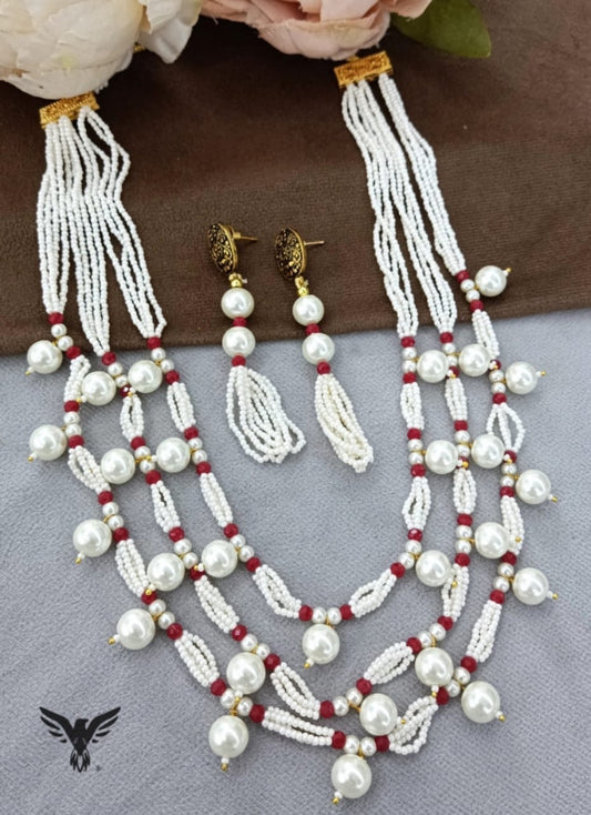 Three layered mala in pearls in Multicolour with hook earrings for women