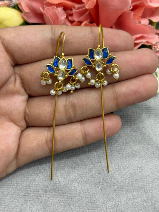 Lotus designer earcuff in pachi kundan in Blue for women