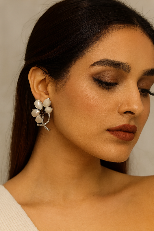 White Prehnite & Mother of Pearl Floral Earrings with CZ stone