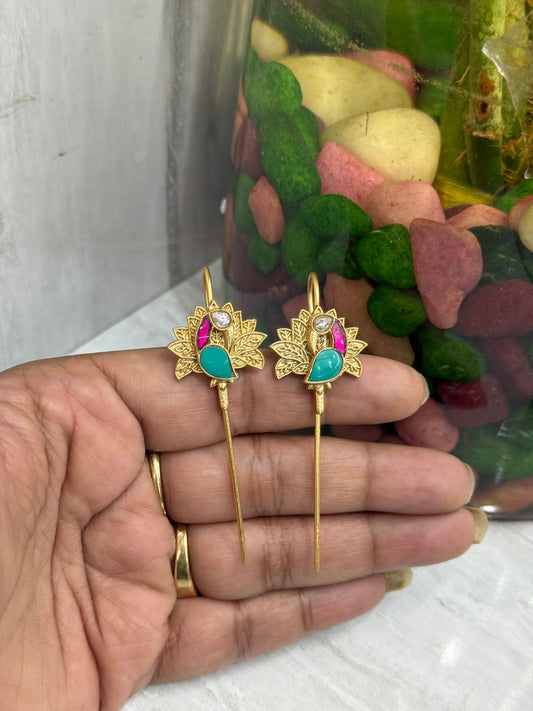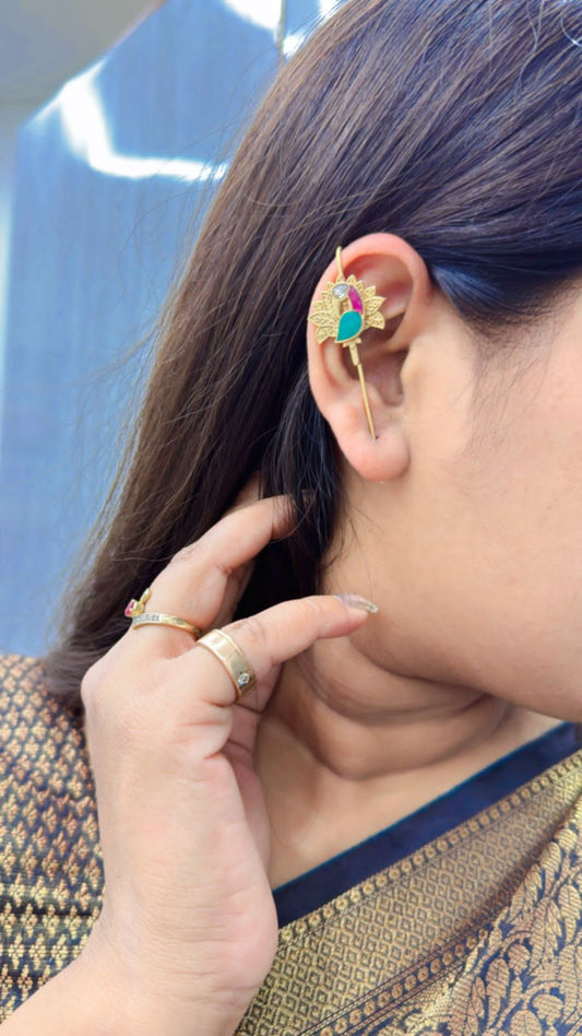 Manasvi multicoloured peacock earcuffs in bugadi style in gold polish antique stones