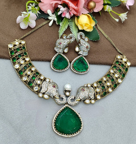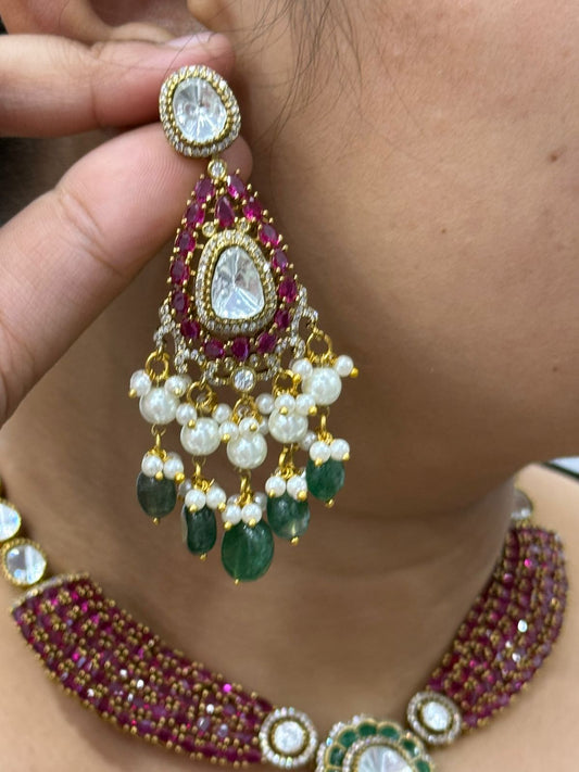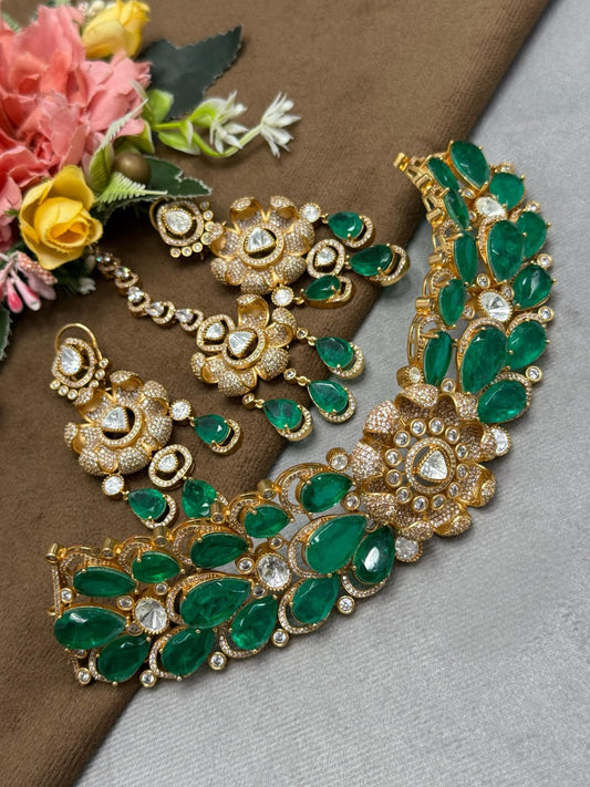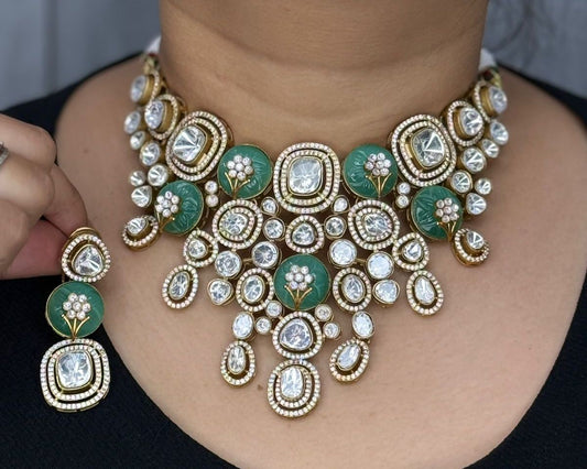 Bridal Necklace with mossanite and polki with green doublet stones with earring and tikka for women