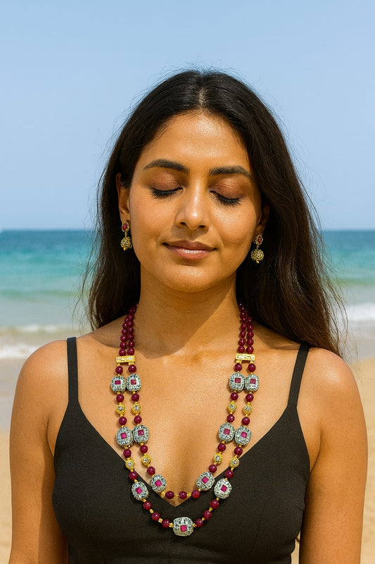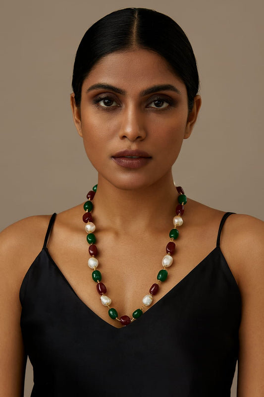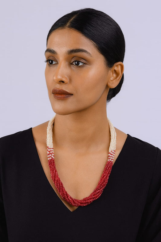 Elegant Multi-Layer Emerald Red Bead & White Pearl mala for Women