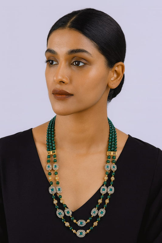 Elegant Multi-Layer Emerald Green Bead & White Pearl mala for Women