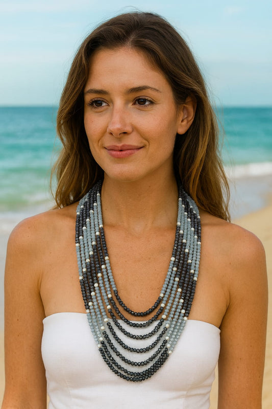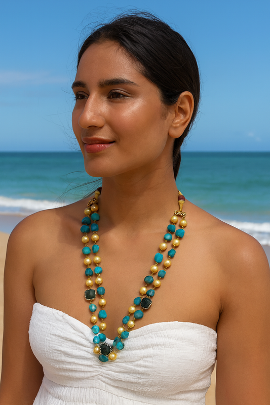 Elegant Double Layer Aqua blue Beaded Mala with Pearls