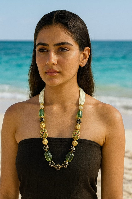 Ethnic Green Stone Mala with Gold Beads & Hand-Painted Enamel Accents