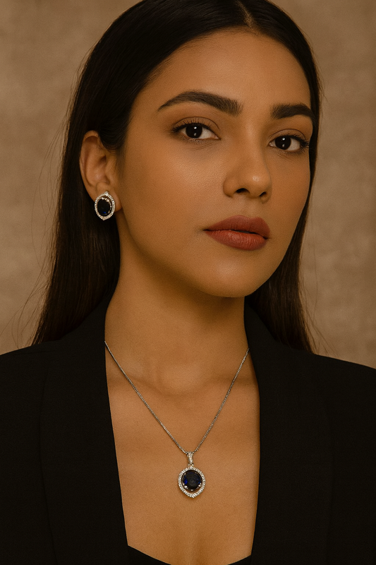 Royal Blue CZ Pendant Set, Earrings & Ring in Silver Finish with Halo Design