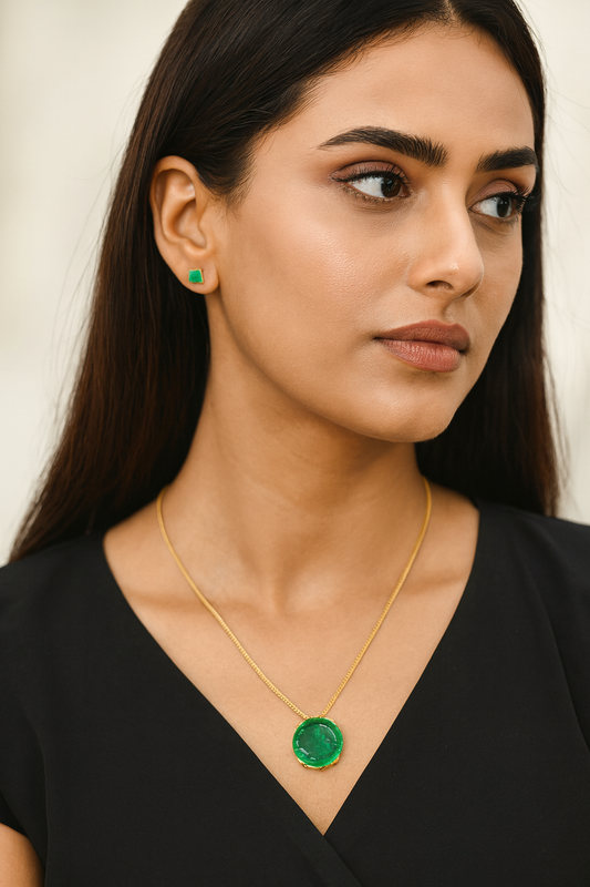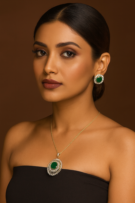 Elegant Green Stone Pendant & studs Set with Sparkling CZ Halo