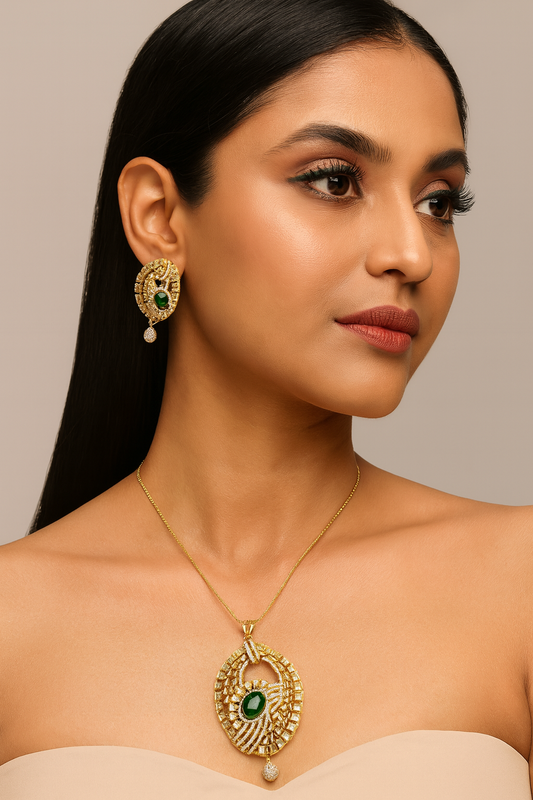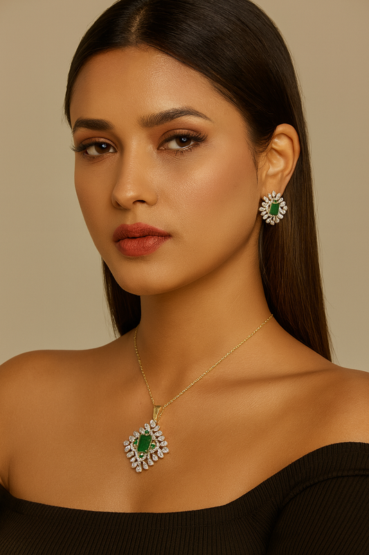Elegant Green Emerald Cut Pendant & studs with Sparkling CZ Stones