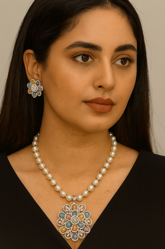 Multicolor Stone Floral Pendant & studs Set with Pearl Beaded Chain