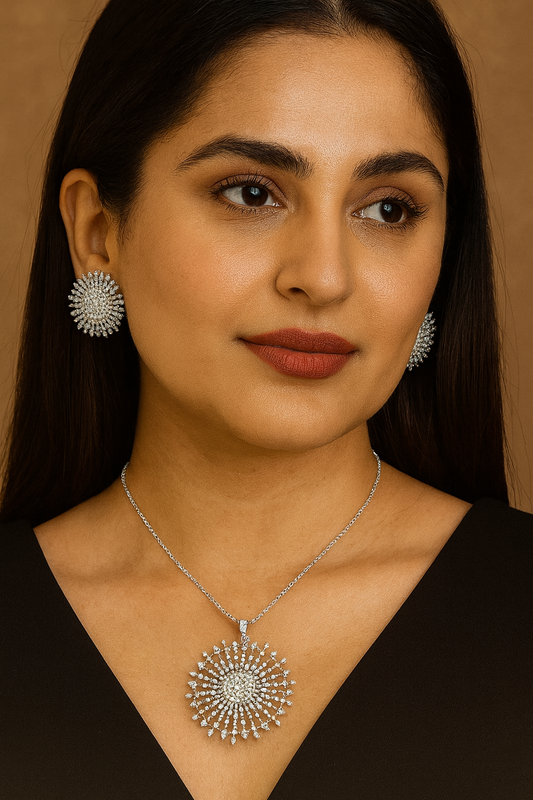 Sparkling CZ Sunburst Pendant Set with studs for women and girls