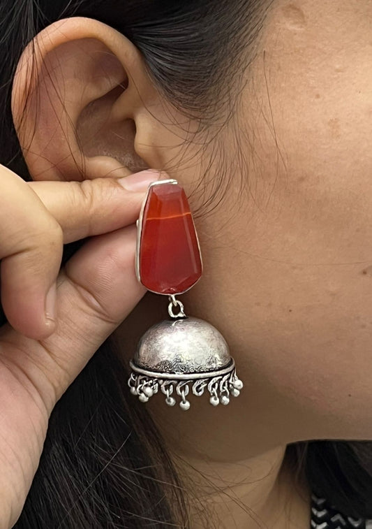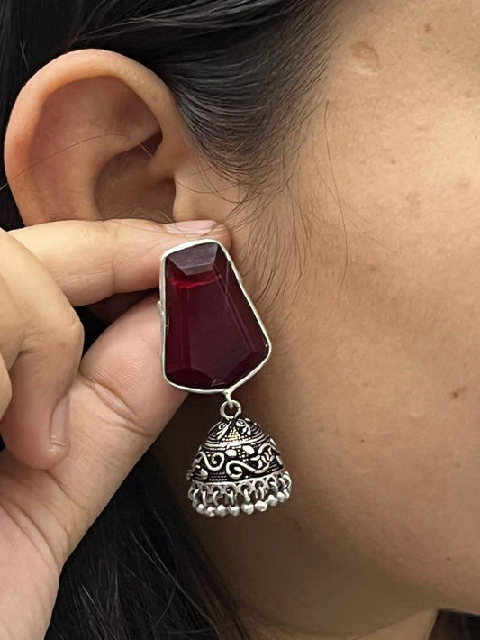 Ethnic Red Stone Jhumka Earrings with Antique Silver Finish