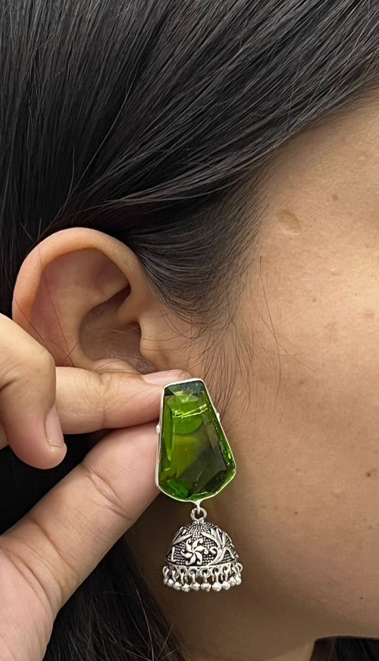 Ethnic Green Stone Jhumka Earrings with Antique Silver Finish