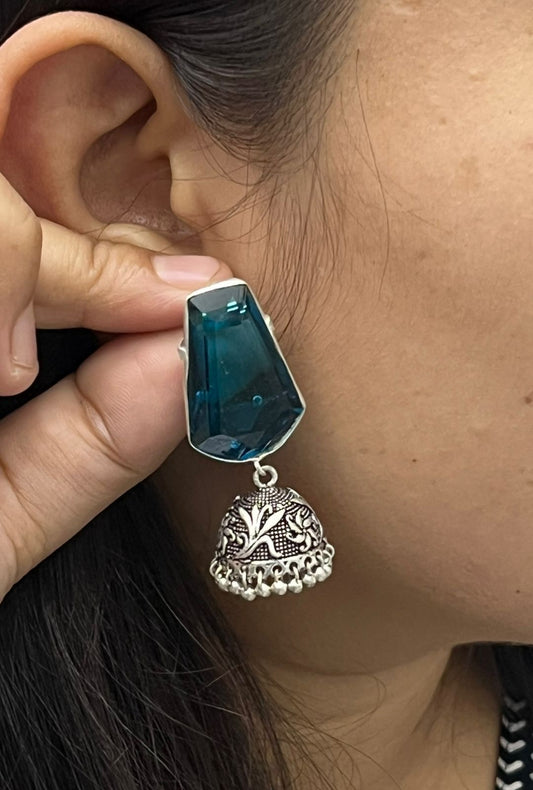 Ethnic Blue Stone Jhumka Earrings with Antique Silver Finish