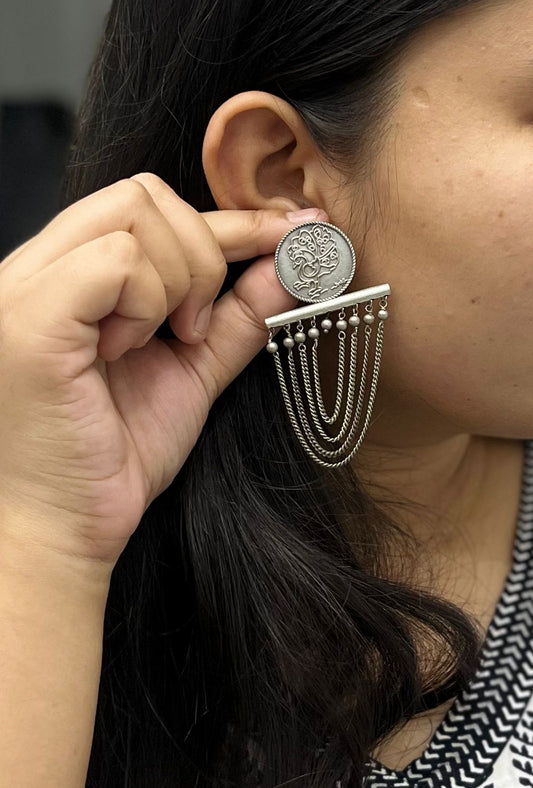 Ethnic Oxidized Peacock Coin Earrings with Layered Chain Detailing