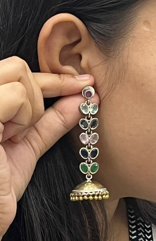 Multicolor Stone Jhumka Earrings with Gold-Plated Beaded Detailing