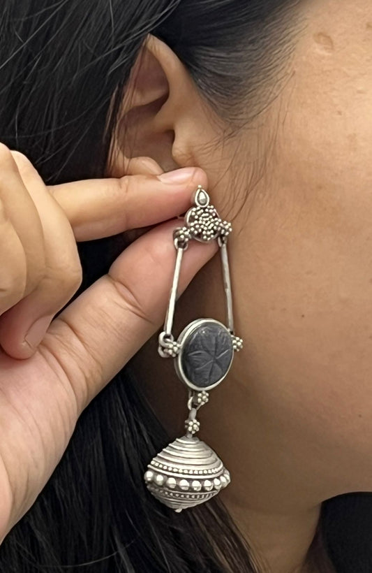 Ethnic Oxidized Long Earrings with Engraved Stone & Antique Dome Beads