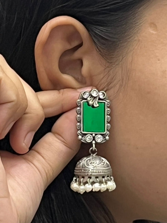 Oxidized Silver Jhumka Earrings with Green Stone Stud & Pearl Beads