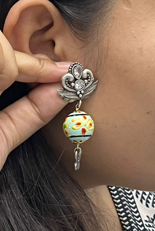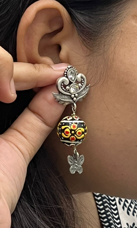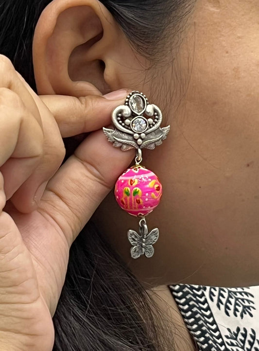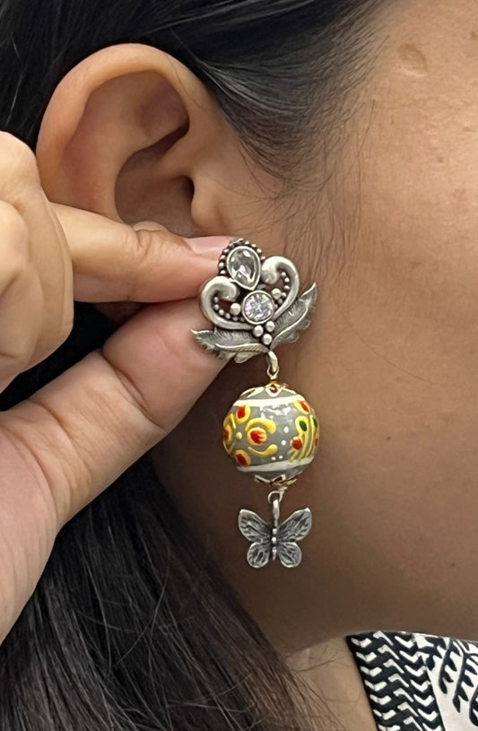 Oxidized Silver Earrings with Hand-Painted Multi colour Beads and Butterfly Drop