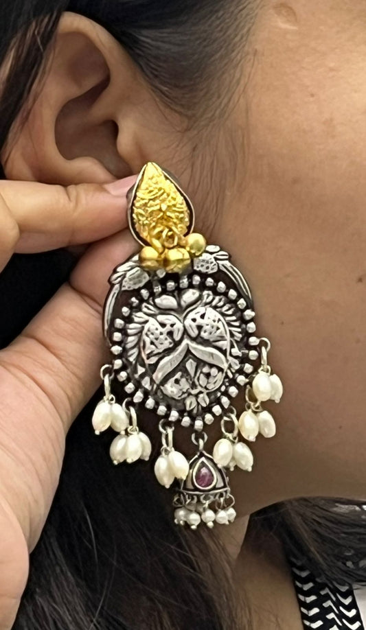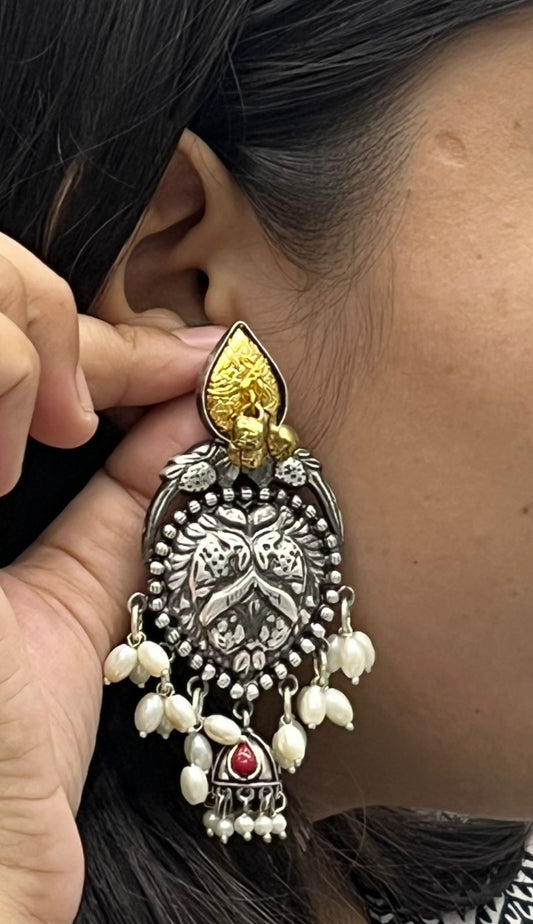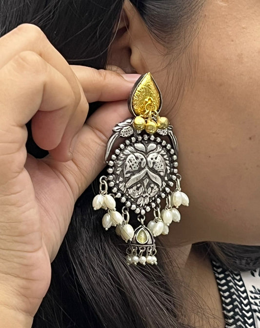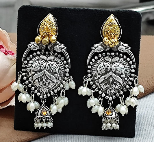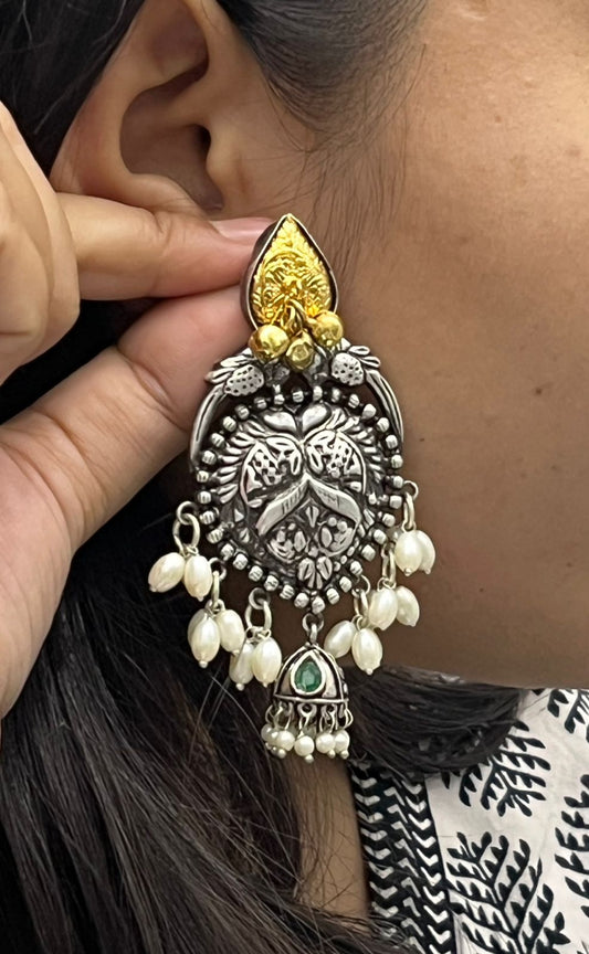Oxidized Silver Jhumka Earrings with Pearl Beads & Antique Gold Detailing